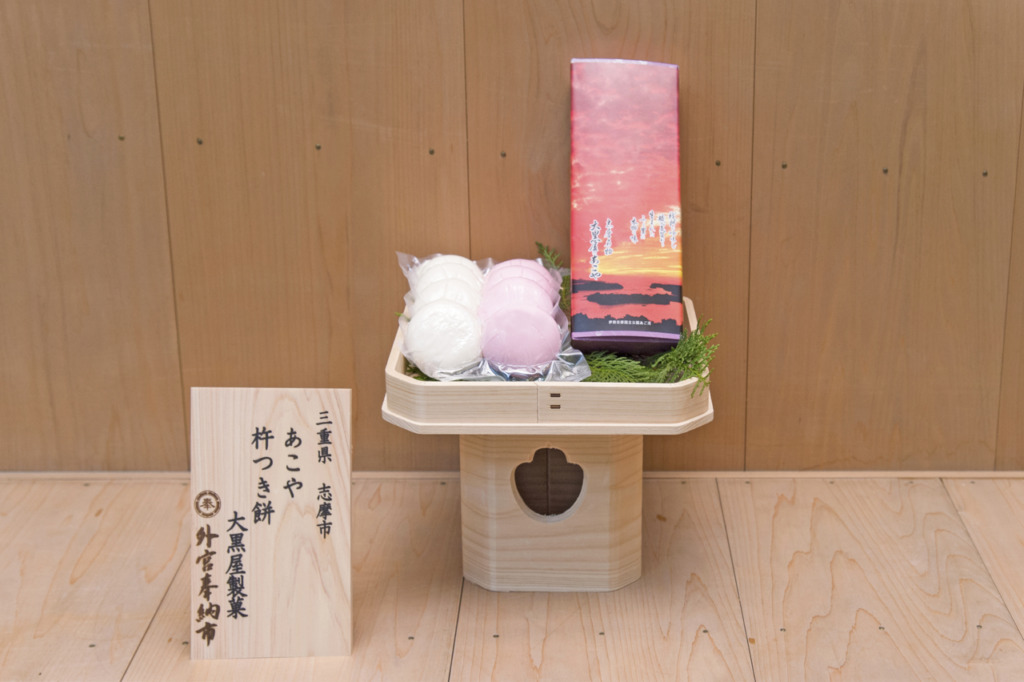 平成28年2月20日(あこや餅)、平成30年3月17日(いばらもち、特製あん、特製練り羊羹)、志摩の地で丹精込めてお作りした餅菓子を奉納し、日々のご加護への感謝と、さらなる精進を誓いました。